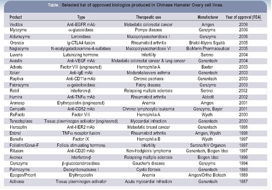 由于哺乳動物細胞結構、功能和基因表達調控的復雜性,外源基因在哺乳動物細胞中的表達與在原核生物中的表達存在較大差異,因而外源基因在哺乳動物細胞中高效表達所需的元件也不同于在原核生物細胞中的表達所需的元件。外源基因在哺乳動物細胞中的表達包括基因的轉錄、mRNA翻譯及翻譯后蛋白質的加工等過程,如蛋白質的糖基化、磷酸化、寡聚體的形成以及蛋白質分子內或分子間二硫鍵的形成等比較復雜,要表達具有生物學功能的蛋白質如膜蛋白、抗體和具有特異性催化功能的酶需要在哺乳動物細胞中進行。 哺乳動物基因表達宿主細胞選擇的基本原則是來源豐富、轉化效率高、表達效果好,CHO細胞作為表達系統除具有上述的特點要求外,還有以下優勢: 1)外源基因被整合到宿主染色體上后,在沒有選擇壓力的情況下能穩定保持; 2)適合多種蛋白質的分泌表達和胞內表達,并且很少分泌自身的內源蛋白,便于下游產物分離純化; 3)對培養基的要求較低,可在無血清培養基中培養; 4)細胞可進行貼壁培養也可進行懸浮培養,且具有較高的耐受剪切力和滲透壓能力; 5)可進行高密度大量培養,進行較大規模生產時其培養量可放大到20000L以上,是目前應用**廣泛的哺乳動物基因表達受體細胞之一。 另有研究者嘗試將類胰島素生長因子IGF基因和轉鐵蛋白基因轉入CHO細胞獲得能自身分泌必需蛋白的“超級CHO”,無需在培養基中轉鐵蛋白和胰島素,細胞可在無血清培養基(SFM)中生長良好。 3 CHO細胞在生物制藥中的應用 目前已有多種外源基因如人組織性纖溶酶原激活劑(tPA)、人促紅細胞生成素(EPO)、乙肝表面抗原(HBsAg)、干擾素γ(IFNγ)、干擾素β(IFNβ)、白細胞介素2(IL2)、凝血因子Ⅷ等在CHO細胞中得到表達。在美G已注冊的大約73種蛋白藥物生產中,應用哺乳動物細胞培養的有35種,CHO細胞培養的就占27種,其中包括10種單克隆抗體。下表是以CHO細胞培養為基質生產的重組制品。