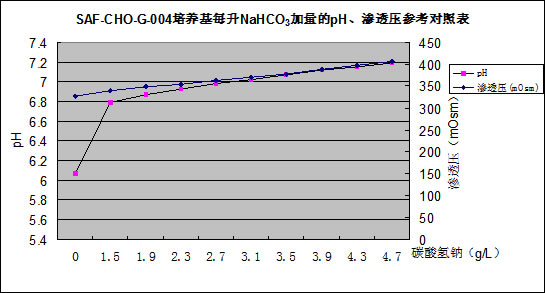5.3.2 貯存 2℃-8℃冷藏,干燥、密封、避光貯藏。【貯存期限】:暫定一年。 5.3.3配制方法(以1L包裝為例) 1. 1)將一袋粉末培養基全部倒入一容器中,用少量注射用水將袋內殘留培養基洗下,并入容器,加注射用水(水溫20℃-30℃)到950毫升,輕微攪拌溶解; 2. 2)加入1.9克碳酸氫鈉; 3. 3)輕微攪拌溶解,加注射用水**1升; 4. 4)如有必要,用1mol / L 氫氧化鈉溶液或鹽酸溶液調pH**所需值; 5. 5)用0.2μm濾膜正壓過濾除菌; 6. 6)溶液應在2℃-8℃下避光保存。 5.3.4 SAF-CHO-G-004培養基不同NaHCO3加量的pH、滲透壓參考對照表